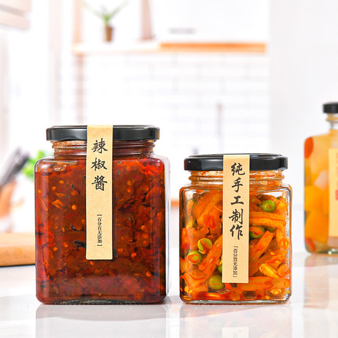 Botella de vidrio vacía cuadrada al por mayor para comida, salsa, nuez, pimienta, Chile con tapa de acero, capacidad sellada de 50ml a 730ml